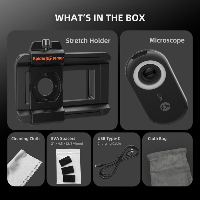 Artikelnummer: SF-Magnifier-Pro OverzichtSpider Farmer 200X Smart Phone Microscope Lens with LED & UV, Nano Zoom