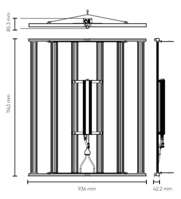 | Technische gegevens | Productspecificaties Kenmerk Specificatie Vermogen 550 watt (±5%) Lichtopbrengst (PPF) 1.540 µmol/s Efficiëntie 2,8 µmol/J Spectrum Full-spectrum (wit + dieprood) Dimbaar Ja, 20% tot 100% Koeling Passief (ventilatorloos) Levensduur >50.000 uur IP-waarde IP65 (stof- en waterbestendig) Gewicht ca. 7,4 kg Afmetingen 114,3 × 93,6 × 8,5 cm Aanbevolen oppervlak ca. 120 × 120 cm (1,44 m²) |