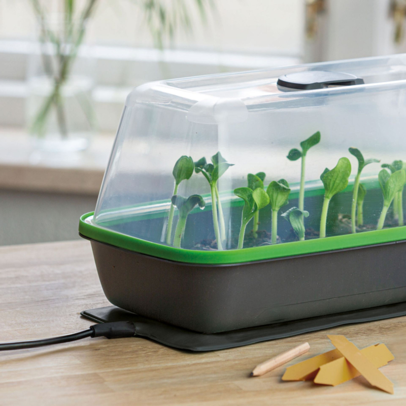- onder een kweekbak of propagator voor het ontkiemen van zaden