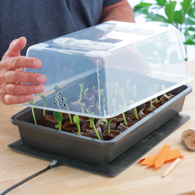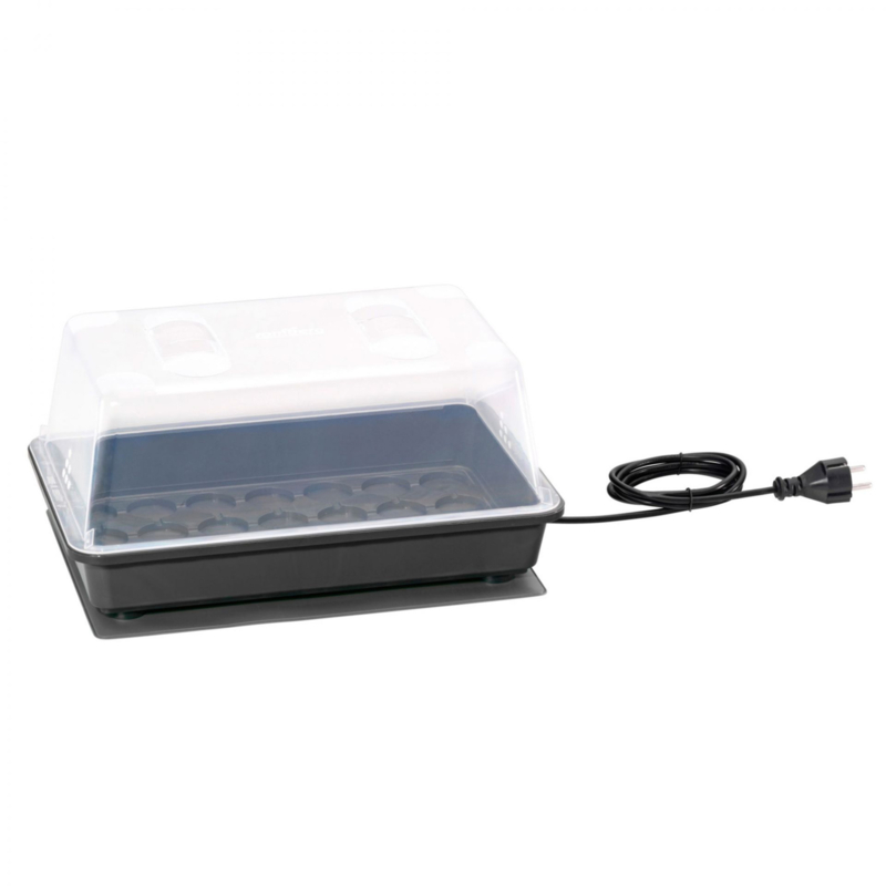 Wat deze kweekkas onderscheidt, is de combinatie van een stevige kweekbak en een efficiënte verwarmingsmat van 17,5 watt. Deze wordt onder de bak geplaatst en zorgt ervoor dat zowel de lucht, het substraat als het gietwater gelijkmatig worden verwarmd. Hierdoor blijven de temperaturen stabiel tussen de 22 en 25 °C – ideaal voor snelle kieming en sterke wortelontwikkeling.