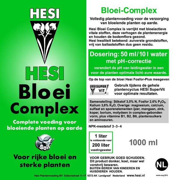 HESI Bloei Complex is een volledige plantenvoeding voor de verzorging van bloeiende planten op aarde. HESI Bloei Complex bevat aanvullende bloei actieve vitale stoffen, deze verhogen de energie van de planten en houden de bodem- en wortelfauna gezond. HESI Bloei Complex bevat ook een pH corrector, deze corrigeert de meststof oplossing naar een, voor de planten, optimale licht zure pH waarde. HESI Bloei Complex wordt aanbevolen voor bloeiende planten, ter compensatie van de verhoogde behoefte aan fosfor en kalium. Dit kan verder worden geoptimaliseerd door de toevoeging van HESI Fosfor Plus.