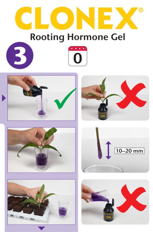 Gebruik Clonex Rooting Gel voor directe wortelstimulatie, Clonex Pro Start als eerste voeding na wortelvorming en Clonex Clone Solution als aanvullende ondersteuning tijdens het wortelproces.
