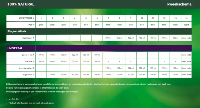 - Download het 100% NATURAL kweekschema voor het beste gebruik en de juiste doseringen.